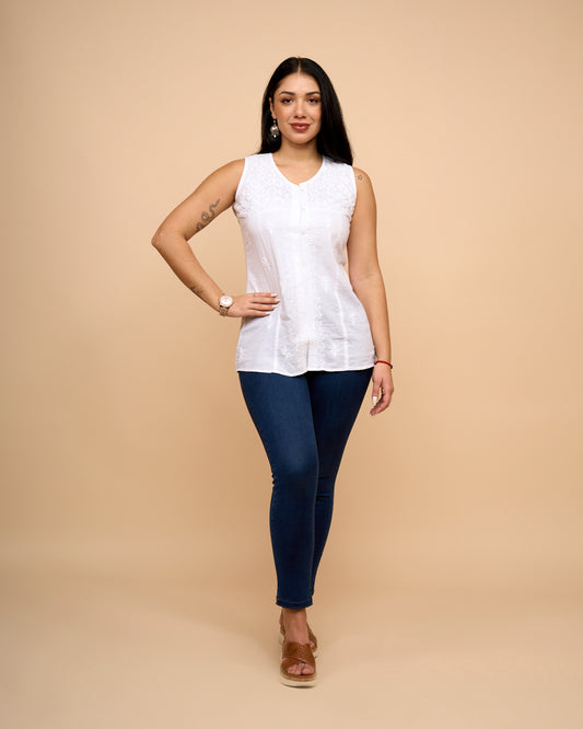 Blusa sin mangas - Blanco Bordado con abertura frontal